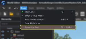 Create a link by selecting from the top menu ''Game →'' '''Copy view link''' option or by using the {{Controls|Ctrl|Shift|L}} shortcut (can be changed in the {{Link|Arma Reforger:Resource Manager: Options#Shortcuts|shortcuts options section}}) | Create a link by selecting from the top menu ''Game →'' '''Copy view link''' option or by using the {{Controls|Ctrl|Shift|L}} shortcut (can be changed in the {{Link|Arma Reforger:Resource Manager: Options#Shortcuts|shortcuts options section}}) | ||